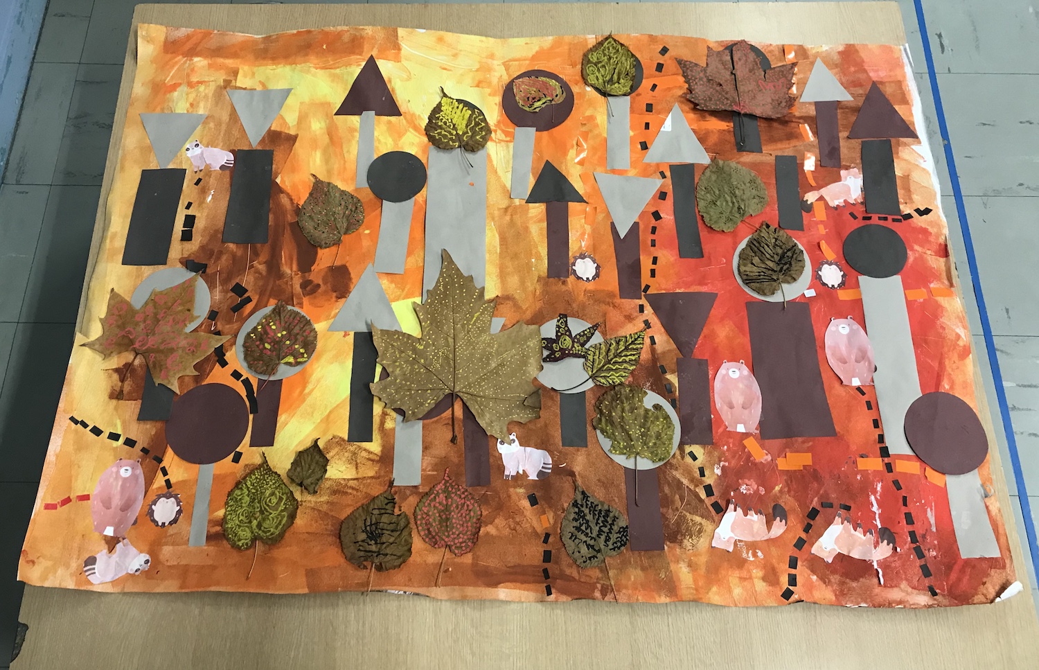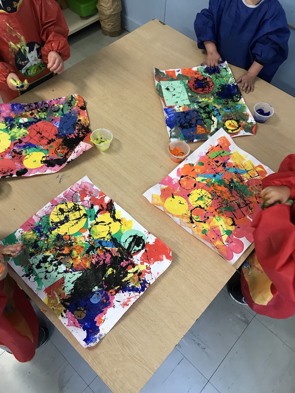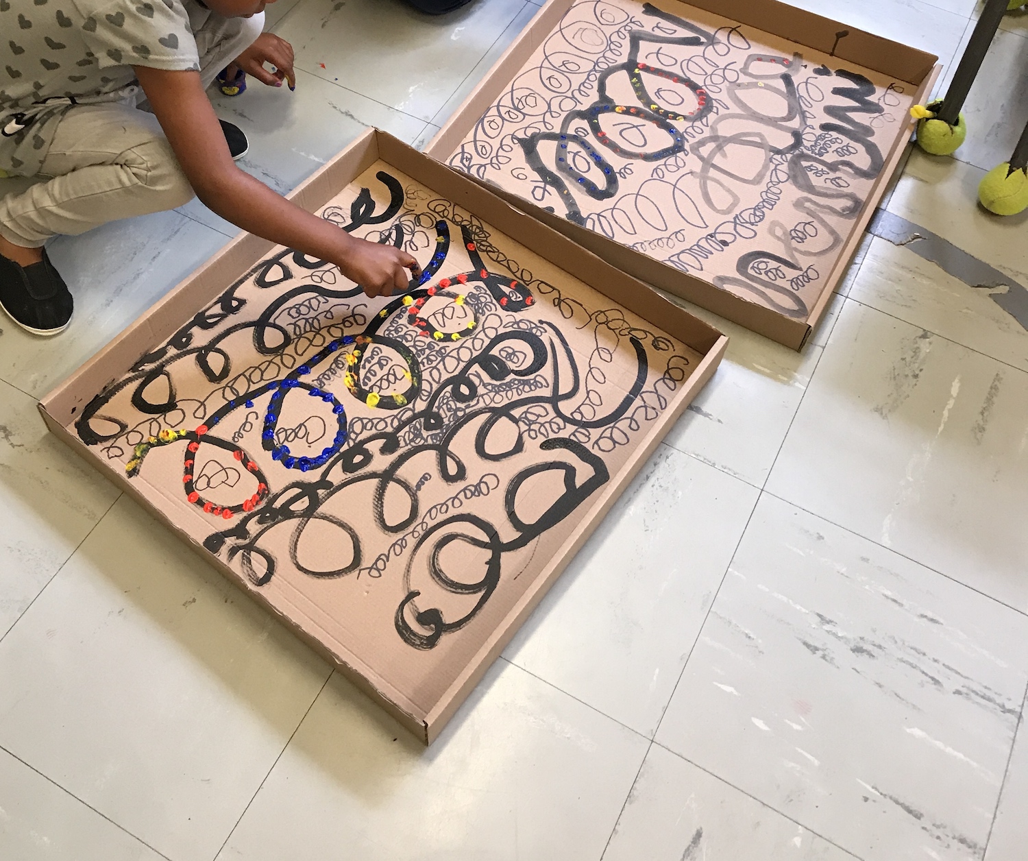 Les activités sont souvent faites sur grand format, ensuite exposées ou alors pour servir de fond à un dessin ou un collage.