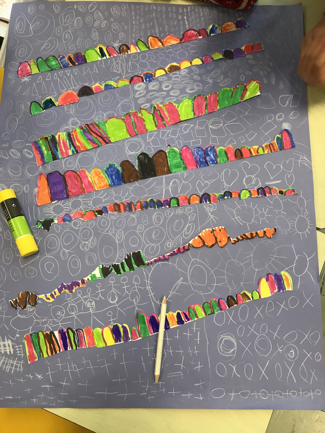 Je travaille énormément le graphisme décoratif pour apprendre aux élèves à développer le geste grapho-moteur mais aussi pour développer la créativité, la culture artistique, la latéralité, la coordination oeil-main … Je trouve que leur motivation, leur plaisir de faire est importants en utilisant différents outils, différents supports, en découvrant des artistes, en accumulant, superposant …