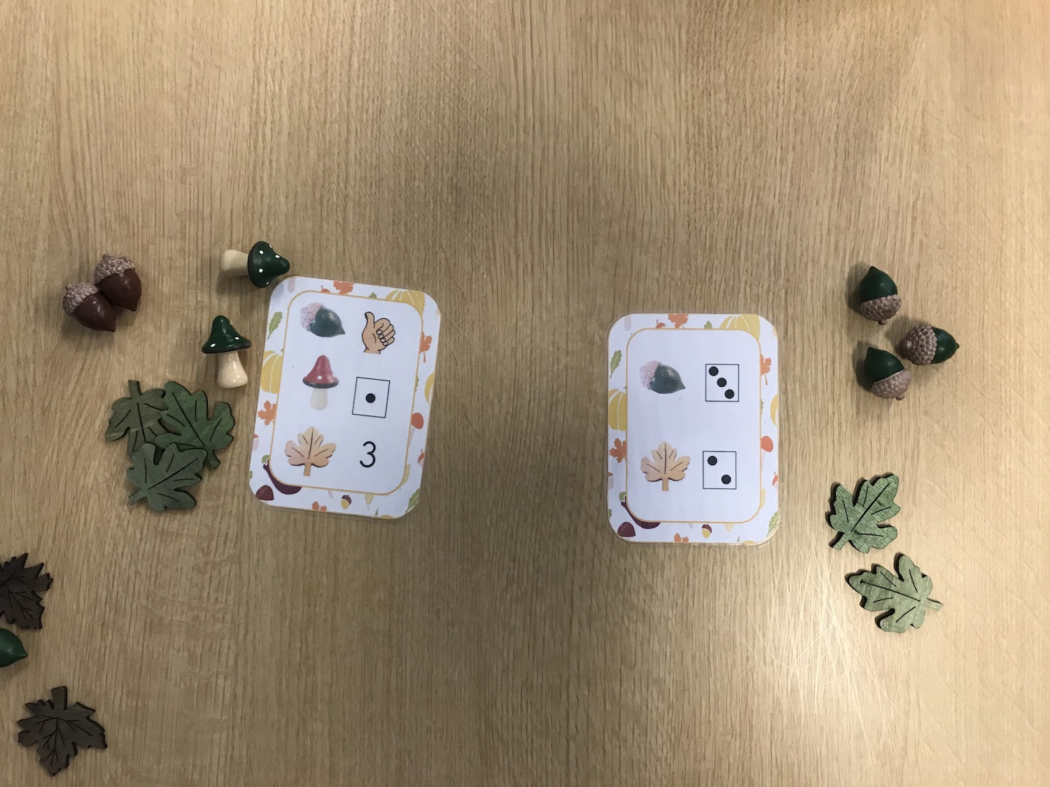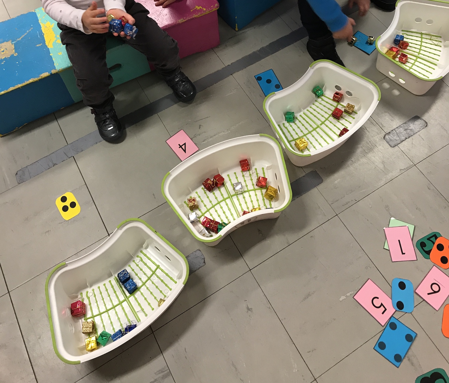 Dans un premier temps, les enfants vont chercher « juste ce qu’il faut » pour remplir le jardin, ni trop, ni pas assez. Plusieurs déplacements puis un seul autorisé. On varie la taille des jardins. Quand ils ont compris le jeu, on complexifie en mettant les fleurs par 2 (les rouges par exemple et les jaunes restent individuelles). Ils doivent donc remplir leur jardin en ayant OBLIGATOIREMENT les 2 couleurs ! petit pb … Cela les amène à décomposer la quantité.