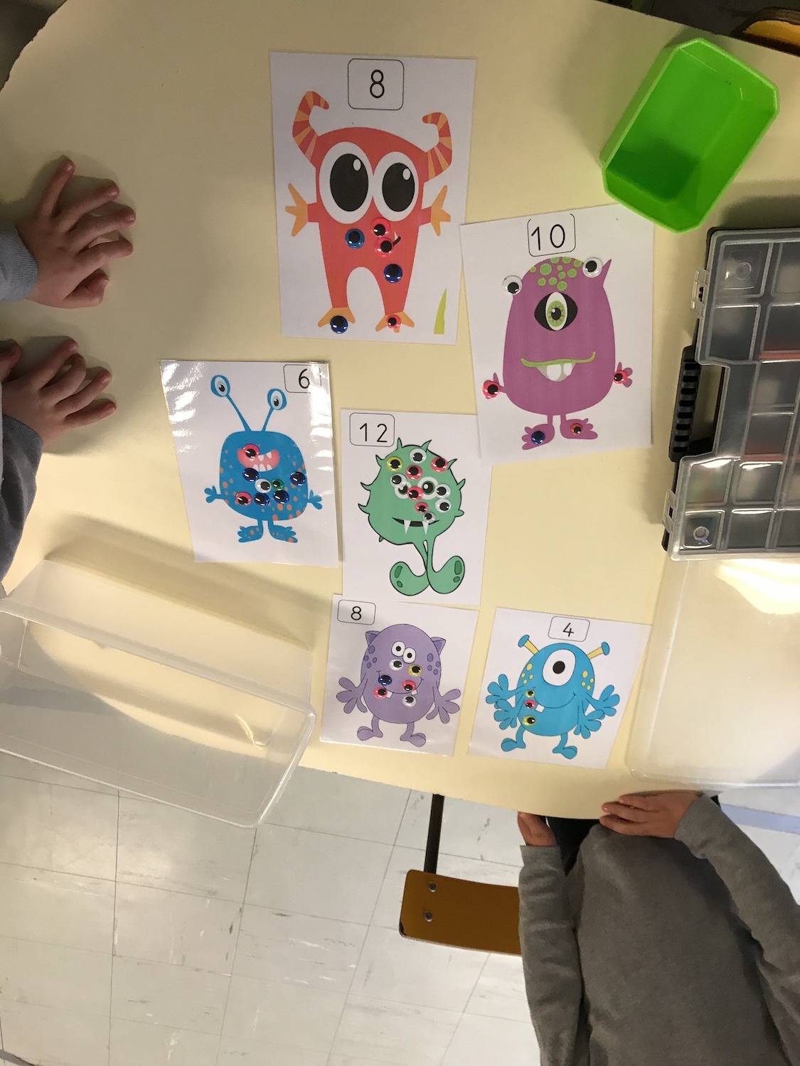 Le monstre qui croque et crache est en fait un jeu d’addition et soustraction. dans la classe, nous utilisons une peluche monstre avec une bouche mais ça peut tout à fait être une boite décorée en monstre.