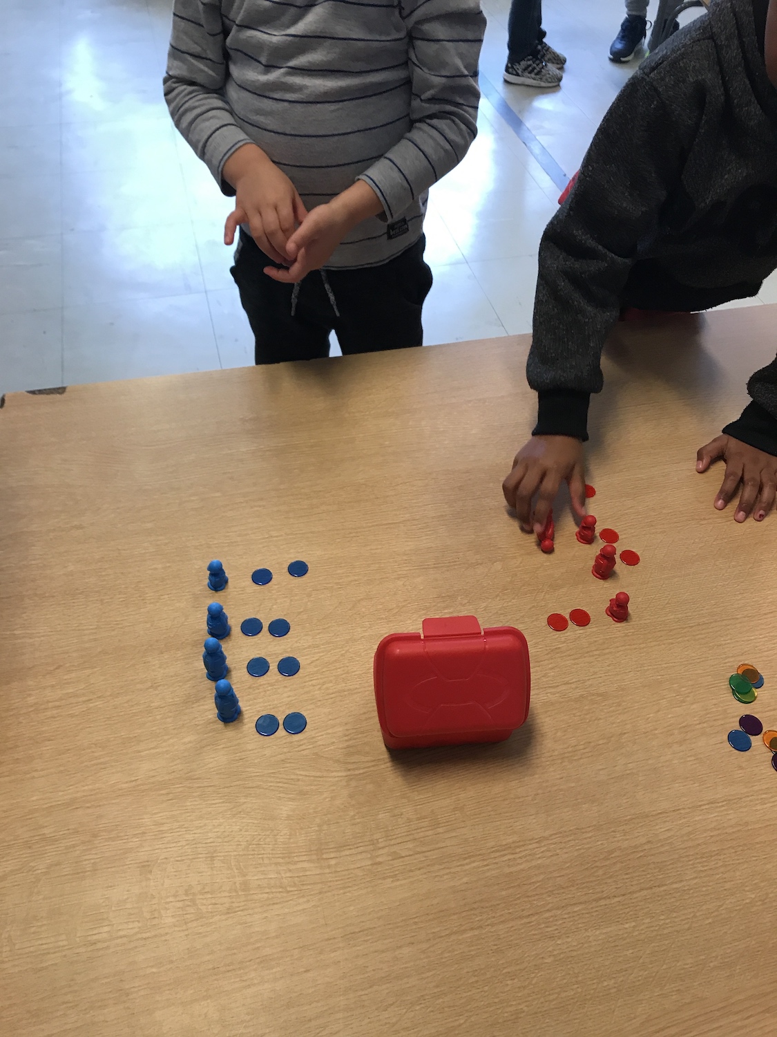 J’explique que je vais nourrir le monstre, je montre aux enfants des pions (sans les compter ni dénombrer) et je les mets dans la bouche. Je le fais plusieurs fois de suite (2 et 1 et 1 par exemple). Je m’arrête, ils doivent alors me dire combien le monstre a mangé de pions.