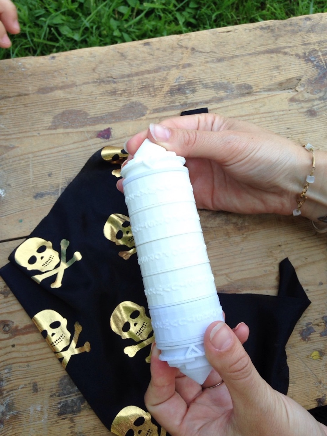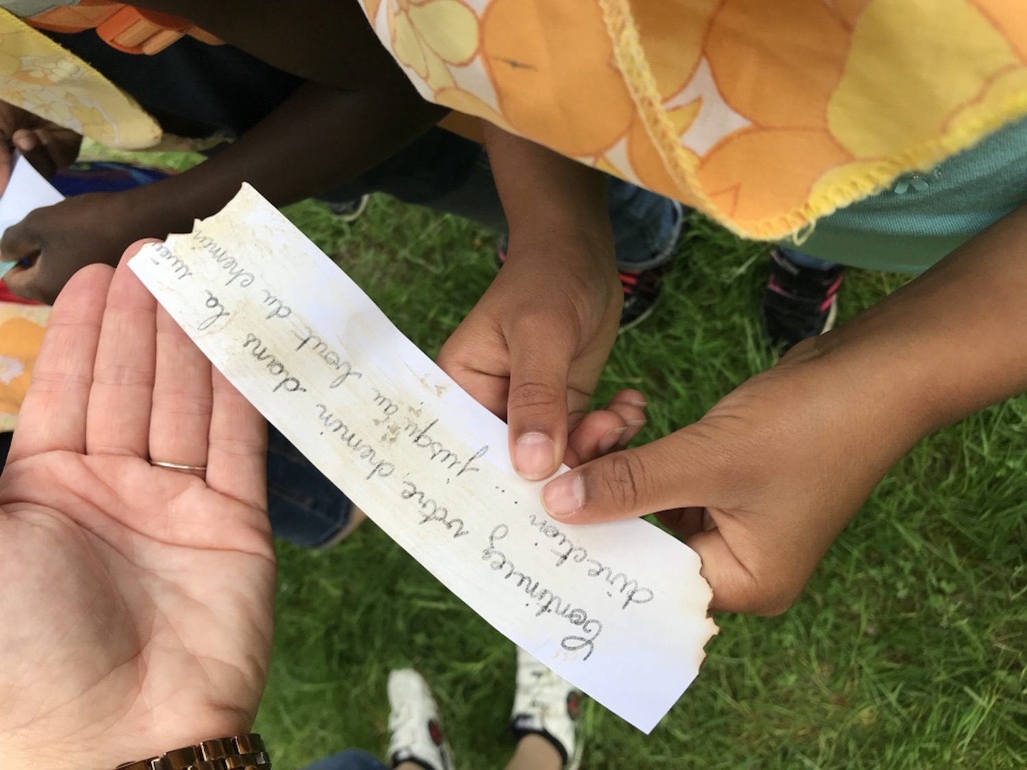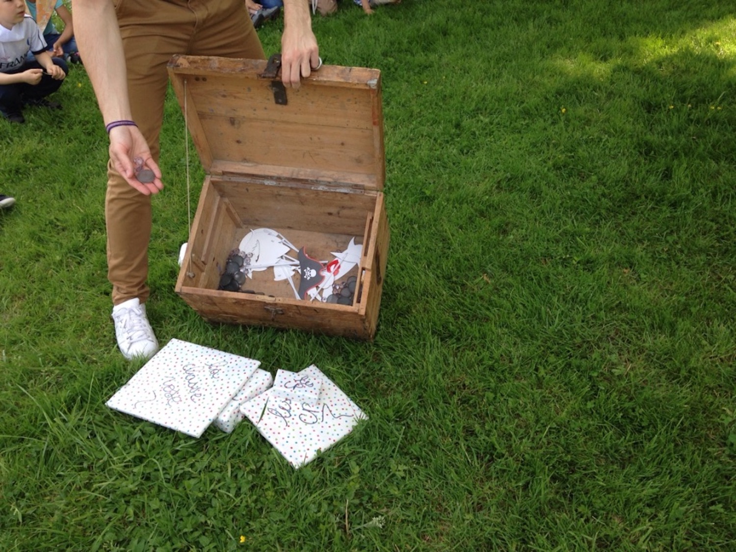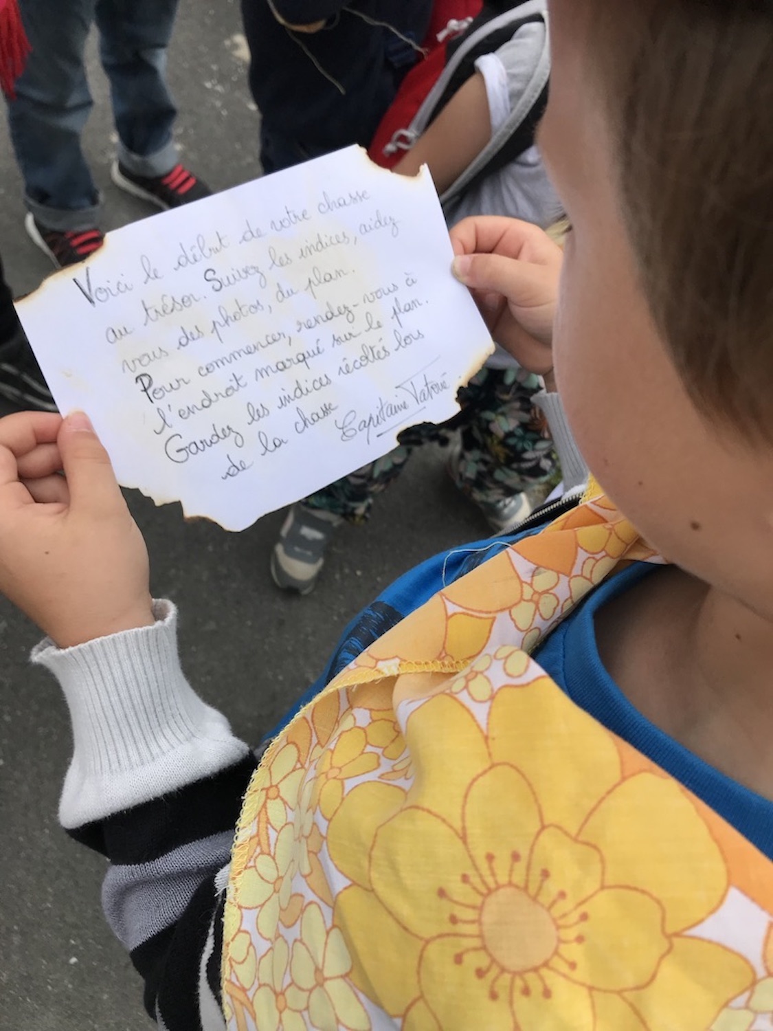 Nous sommes partis la journée avec 9 adultes pour 7 équipes. A la fin de la chasse au trésor, des lettres écrites sur les enveloppes ont permis d’ouvrir le cryptex qui contenait la clé du coffre. Dedans, des cadeaux pour chaque classe ( des livres sur les pirates et des jeux) et une pierre précieuse du trésor de Capitaine Tatoué pour chaque enfant.