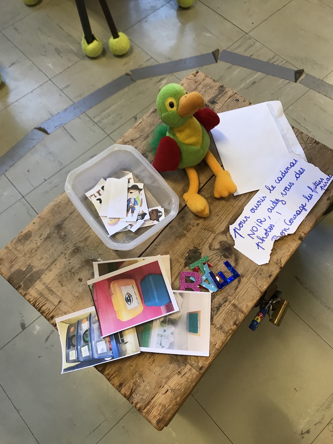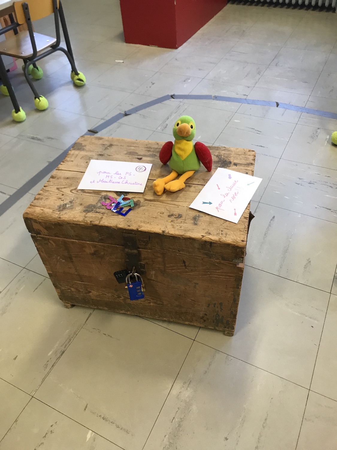Sur plusieurs semaines, résoudre des énigmes mathématiques ou langagières pour ouvrir chacun des 4 cadenas du coffre. C’est Ulli, notre marotte perroquet, qui nous apporte chaque lettre et nous explique quoi faire.