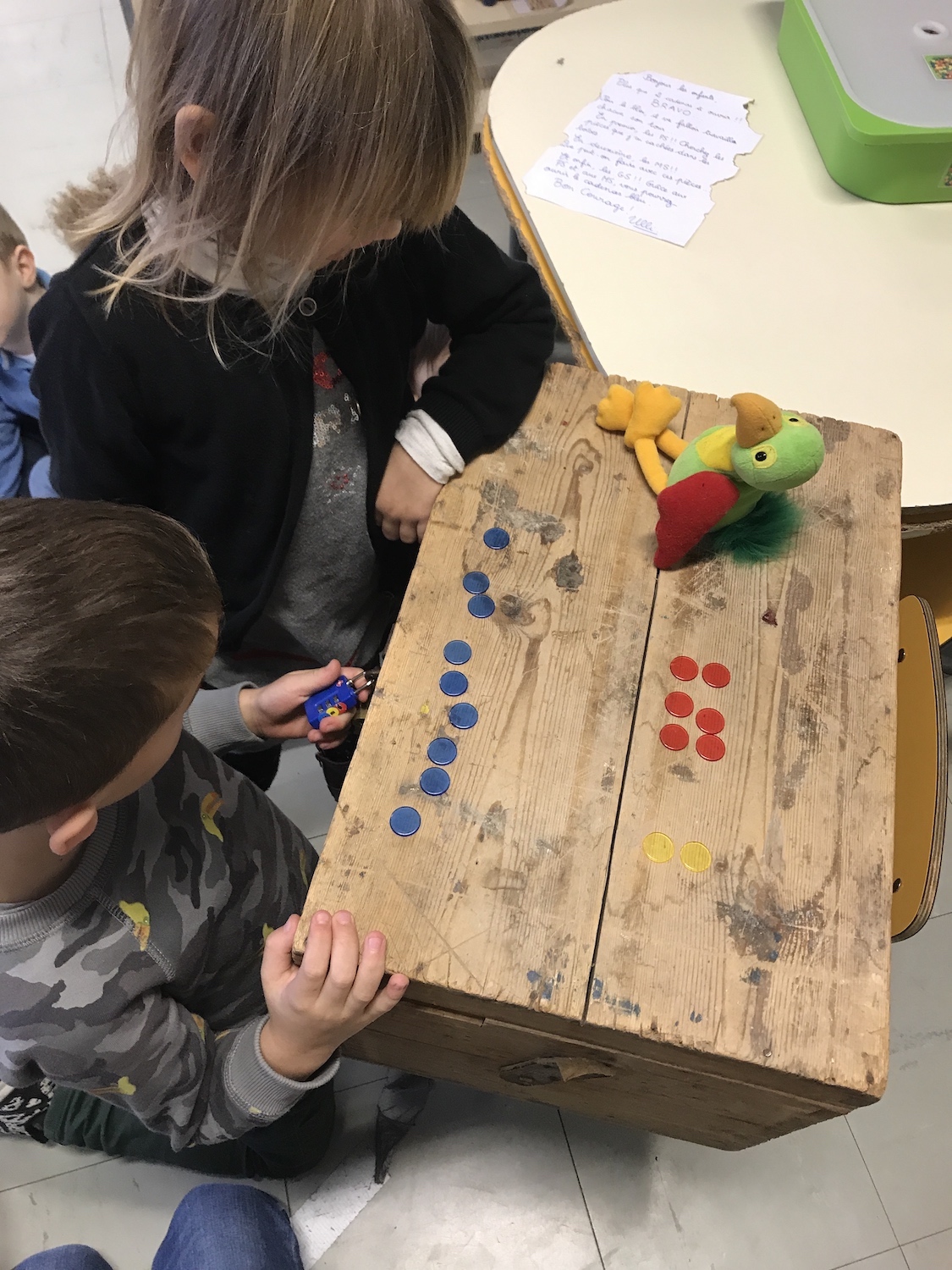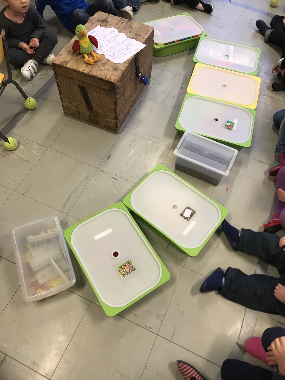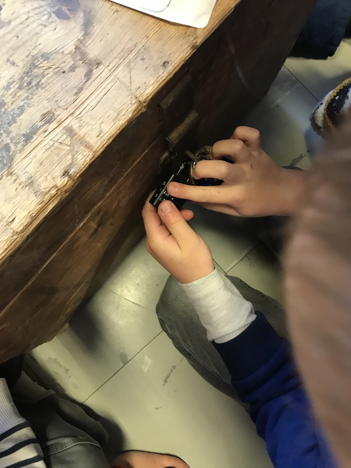 Avec les 3 sections dans la classe, il faut penser à tous : chercher des pièces dans les boites de jeux pour les plus jeunes, les dénombrer et rentrer le nombre dans le cadenas pour les plus grands. Nous avons aussi écouté des sons qui nous ont emmenés dans différents lieux de l’école, pour y trouver des lettres et les assembler, pour écrire un mot qui ouvre le cryptex, chercher des pirates dans les différents meubles de la classe … Une manière ludique en début d’année de visiter l’école, de connaitre les lieux de la classe.