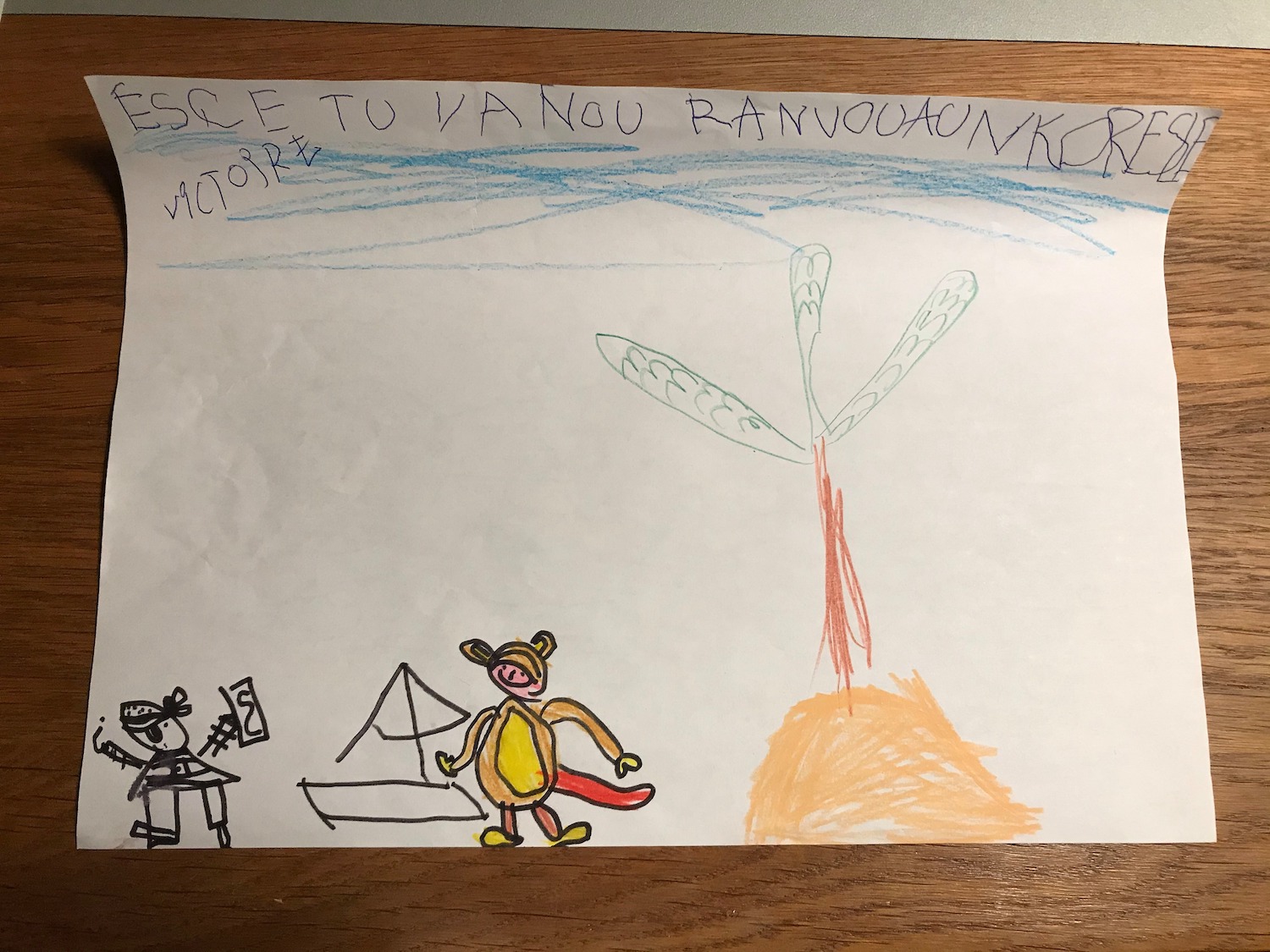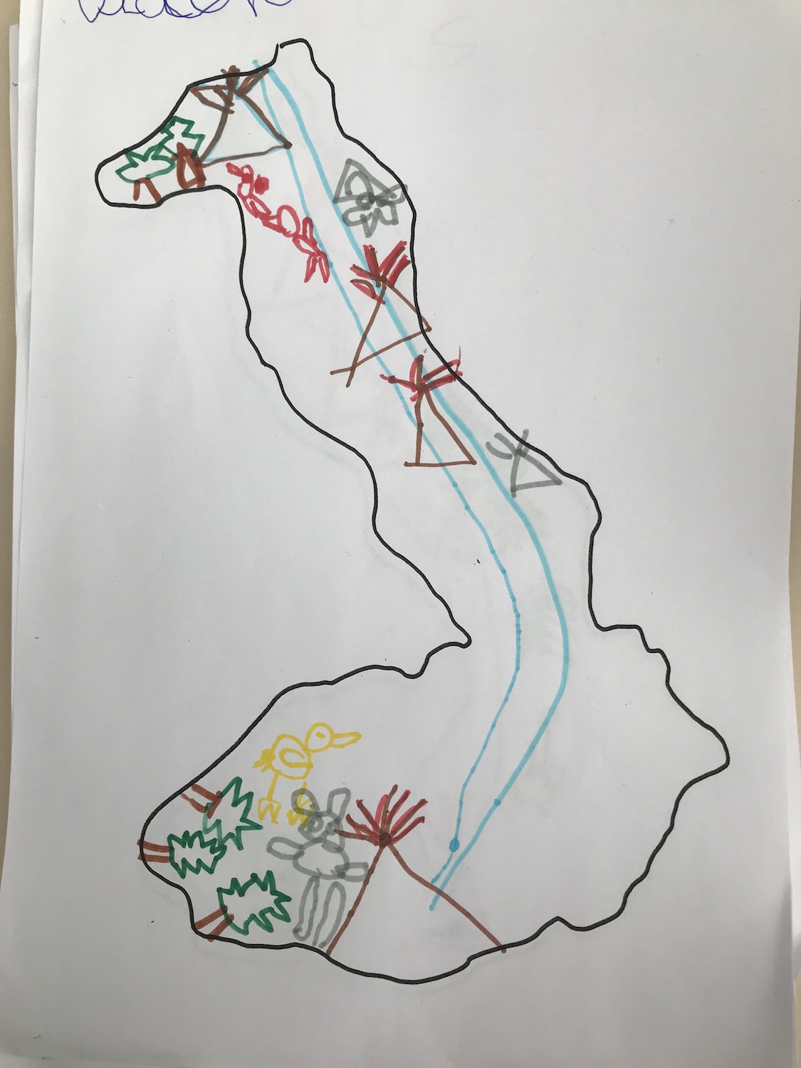 Écrire au pirate, une manière motivante pour faire entrer tout le monde dans les écrits autonomes et la fonction de l’écrit. Les plus jeunes ont dessiné des îles : un morceau de terre entouré d’eau.