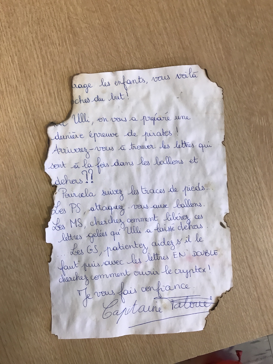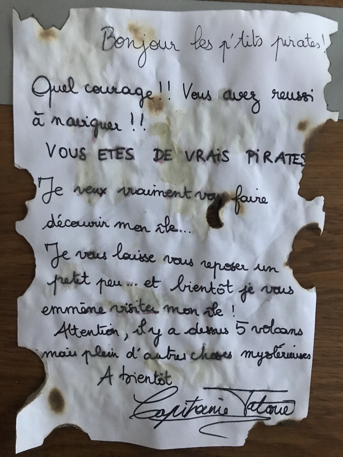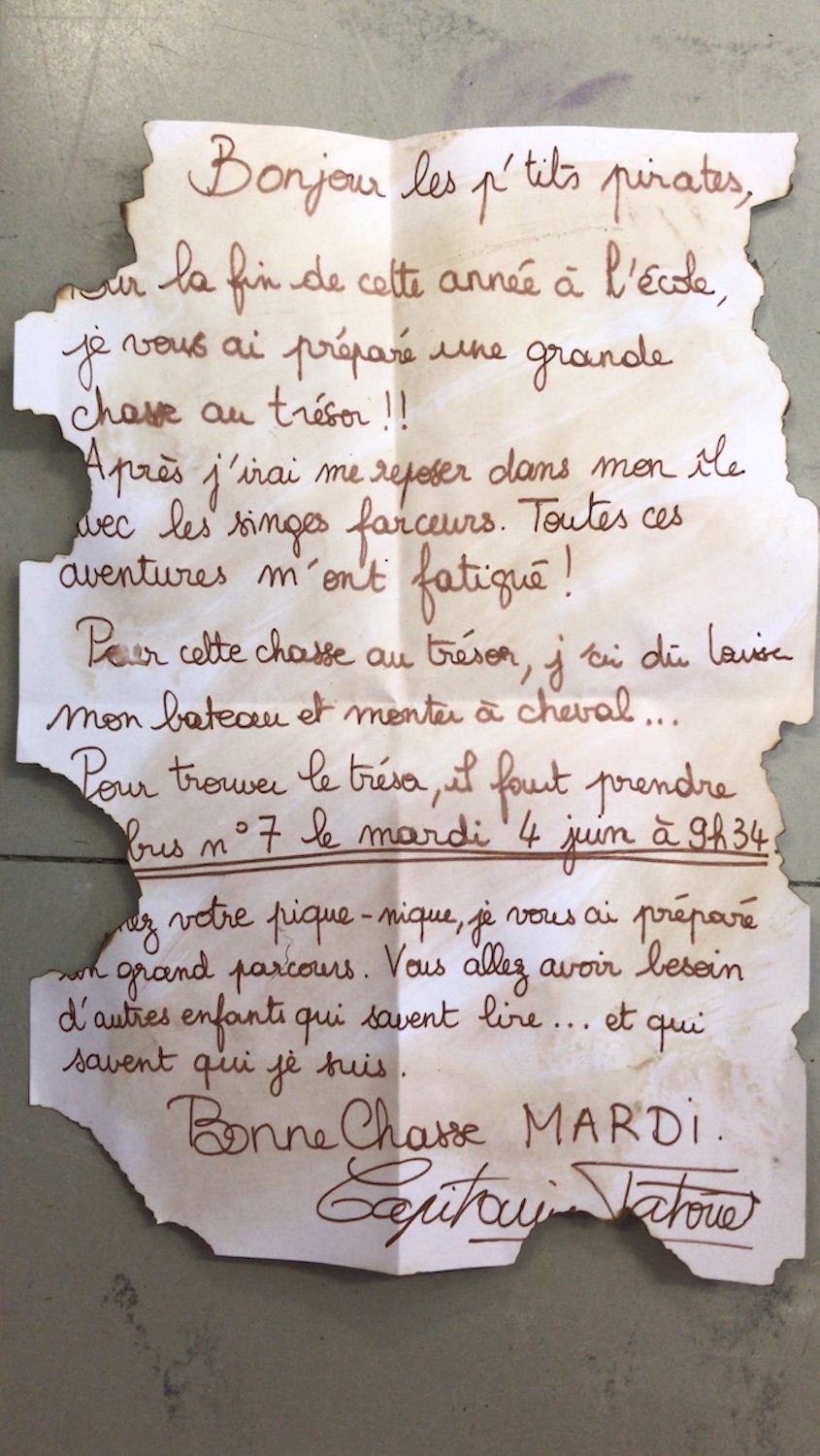 A la fin de cette aventure, j’ai choisi de ne pas dévoiler aux enfants qui était réellement le Capitaine, mais il est important de donner une fin à cet univers. Le Capitaine nous a donc envoyé un film retraçant toutes nos aventures (donné par QRCODE aux élèves) et une lettre. Nous l’avons remercié de nous avoir fait vivre toutes ses aventures (évaluation bilan sur l’encodage pour les MS et GS).