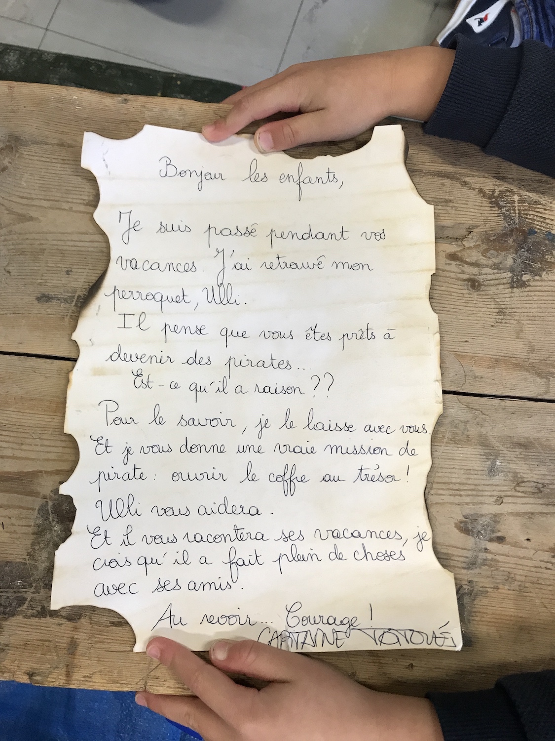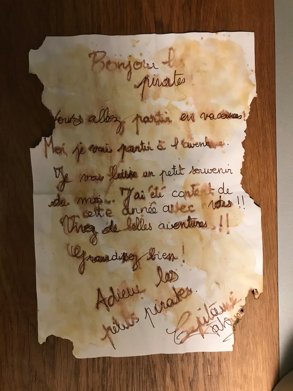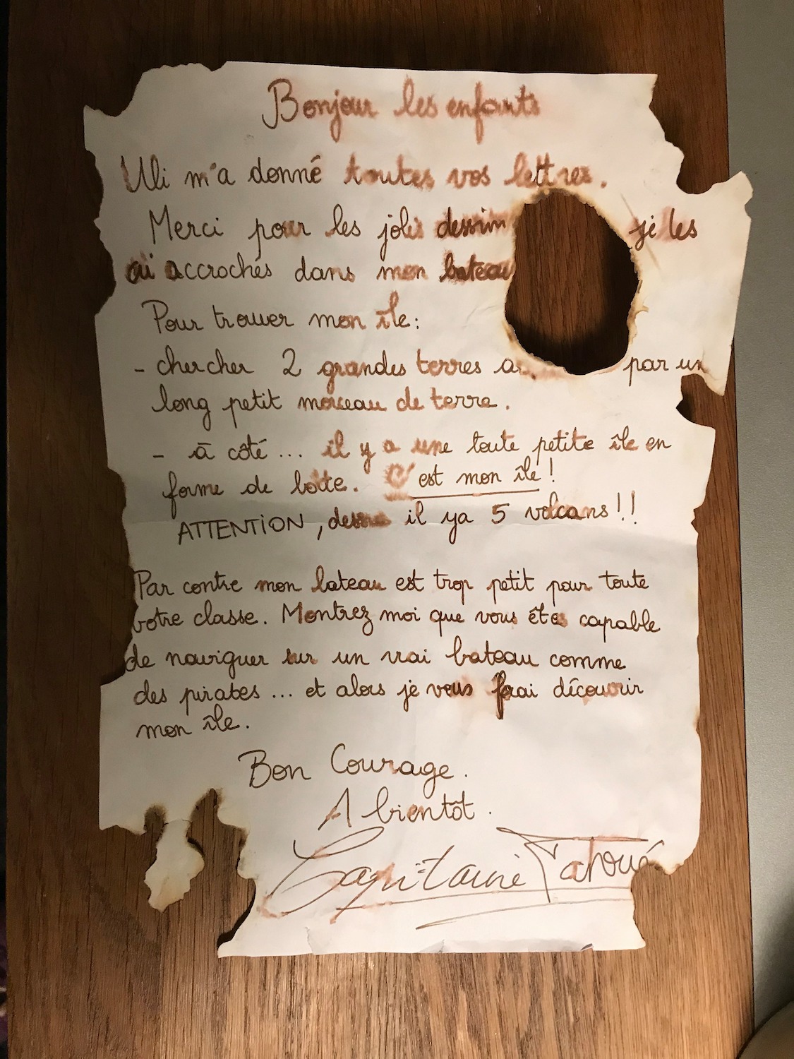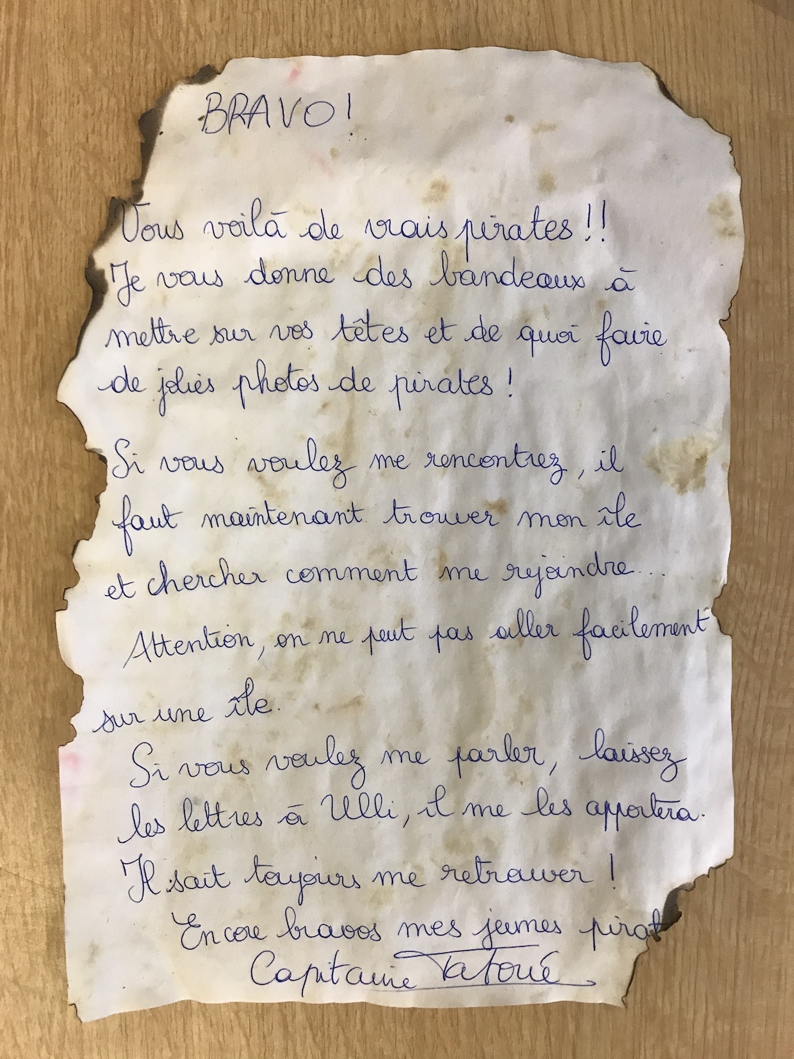 A la fin de cette aventure, j’ai choisi de ne pas dévoiler aux enfants qui était réellement le Capitaine, mais il est important de donner une fin à cet univers. Le Capitaine nous a donc envoyé un film retraçant toutes nos aventures (donné par QRCODE aux élèves) et une lettre. Nous l’avons remercié de nous avoir fait vivre toutes ses aventures (évaluation bilan sur l’encodage pour les MS et GS).
