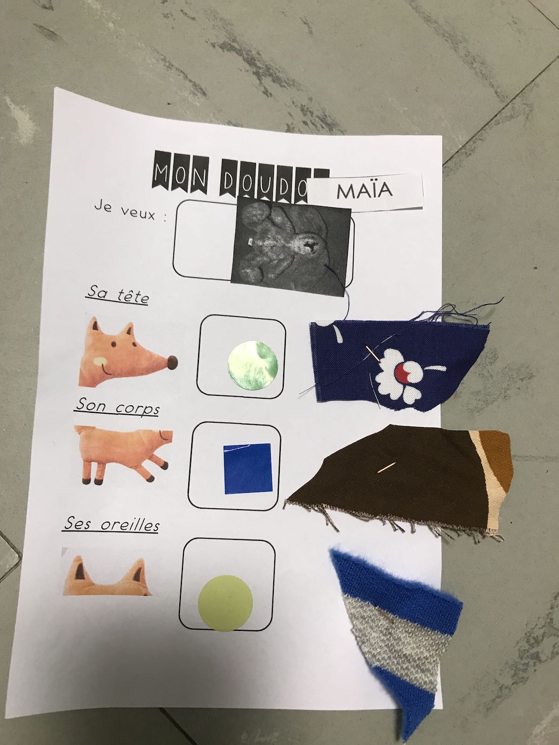 Après avoir fouillé partout dans l’école, fait appel aux parents, me voilà en possession de dizaines de tissus différents : les élèves choisissent un tissu pour chaque partie de leur doudou.