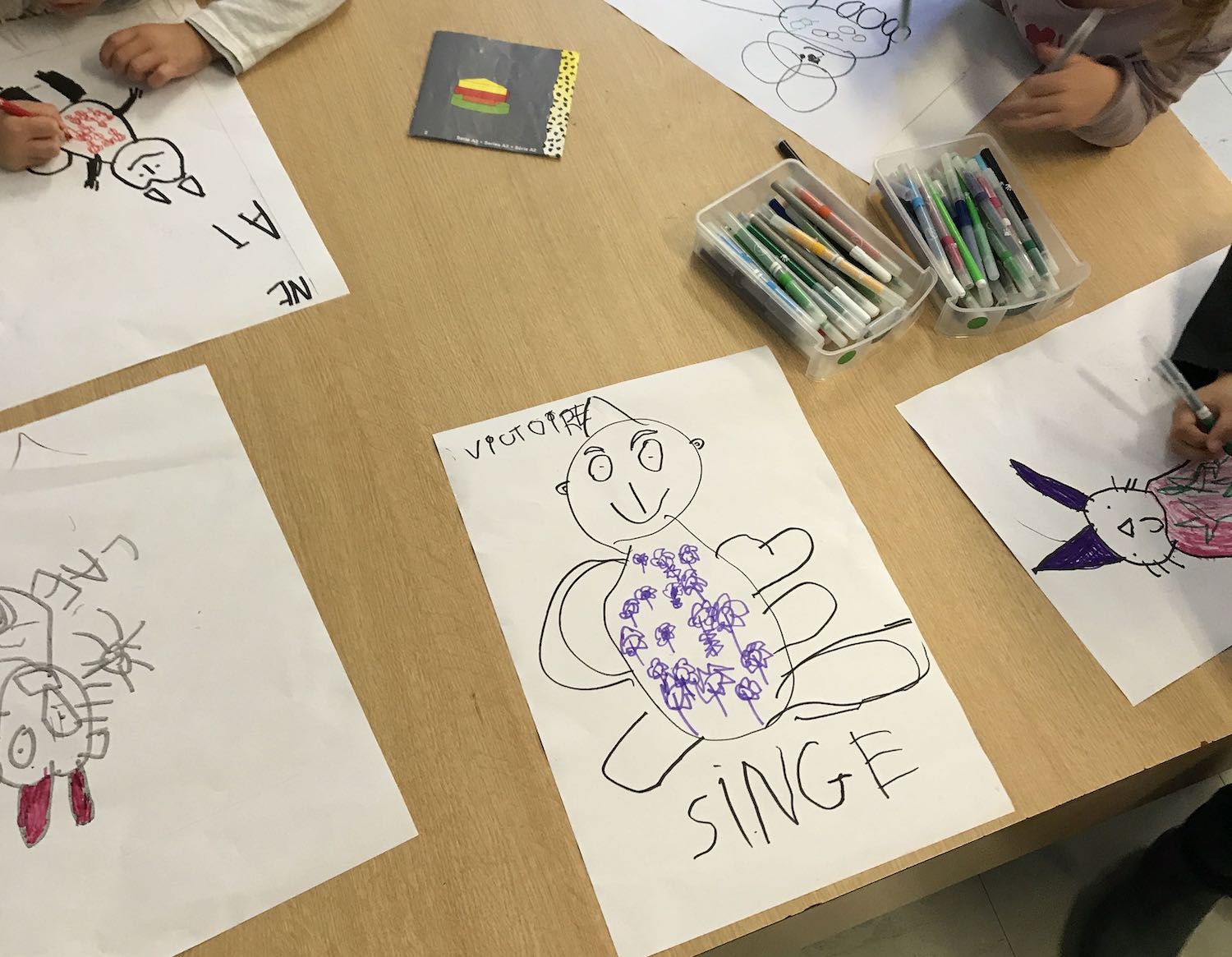Ensuite les enfants ont inventé leur doudou : les MS et les GS ont dessiné leur doudou préféré en essayant de représenter les caractéristiques de l’animal. Les PS ont choisi l’animal puis la forme de la tête et du corps.